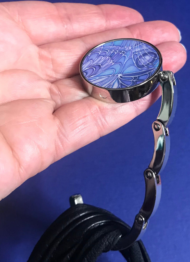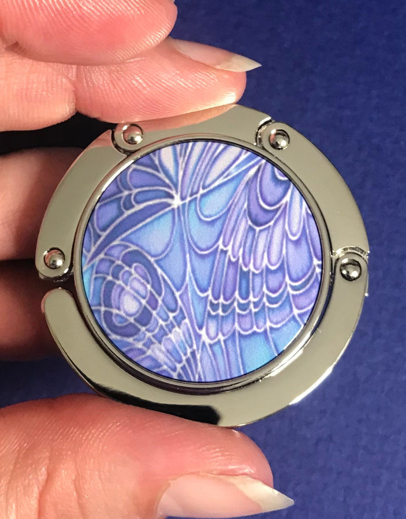 Keep your Handbag Safe!! This handy bag hanger features those gorgeous hues of blue lilac purple in this Blueberry butterfly wings design. I've taken the design from one of my hand painted original silk paintings.
