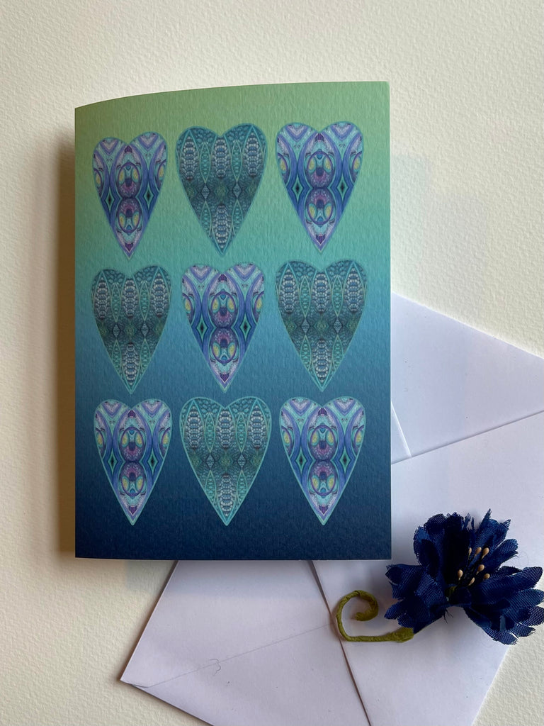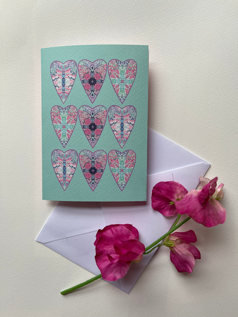 Pretty intricate folky and bohemian styles. Arabesque hearts, Butterfly Hearts and Persian Hearts greetings cards in vibrant blues & greens, mint & pink and pink &plum. Perfect for any occasion including valentines. Purchase individually or as a set of three.